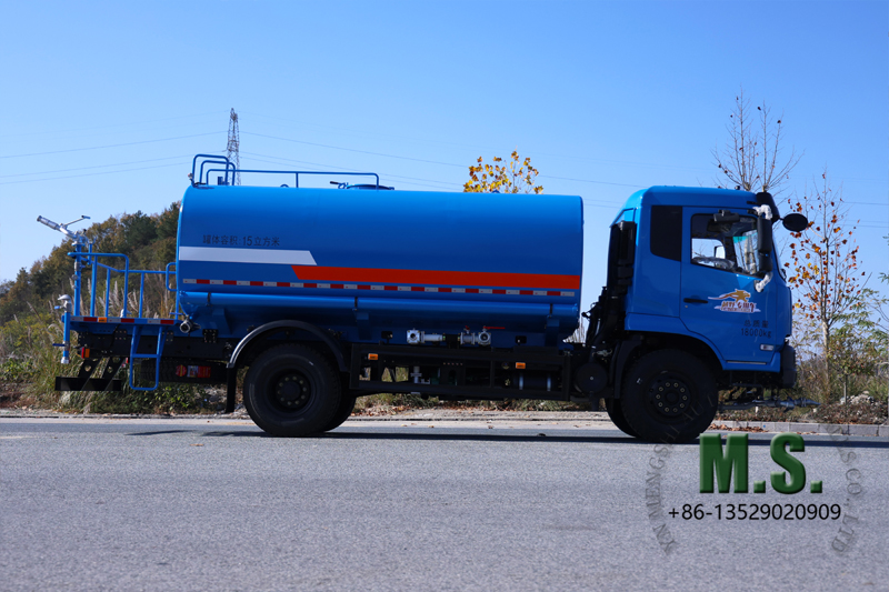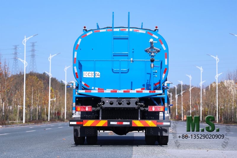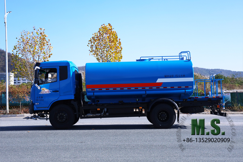 The vehicle features forward spray, rear spray, side spray, and high-pressure washing functions. Watering modes include stationary and moving states, requiring corresponding activation of the stationary PTO and moving PTO switches inside the cab. Manual ball valves control water spraying and suction throughout the vehicle. The tank body has a thickness of 4mm and is internally treated for corrosion resistance.